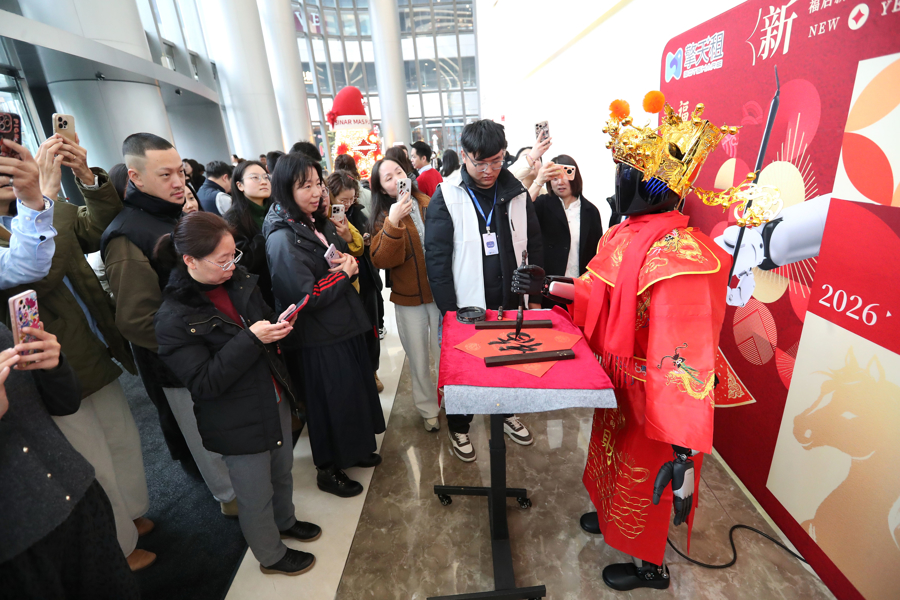 上昼10时刚过,白玉兰广场一楼大堂便聚拢了不少围不雅东说念主群。只见一台东说念主形机器东说念主正稳稳握管,在红纸上书写“福”字,笔画流通、力说念均匀,用时1分10秒傍边,引得在场白领纷繁安身拍照。这是由智元机器东说念主旗下子公司“擎天租”带来的远征旗舰机器东说念主,正用它的“书道绝技”为天下奉上新春祝颂。