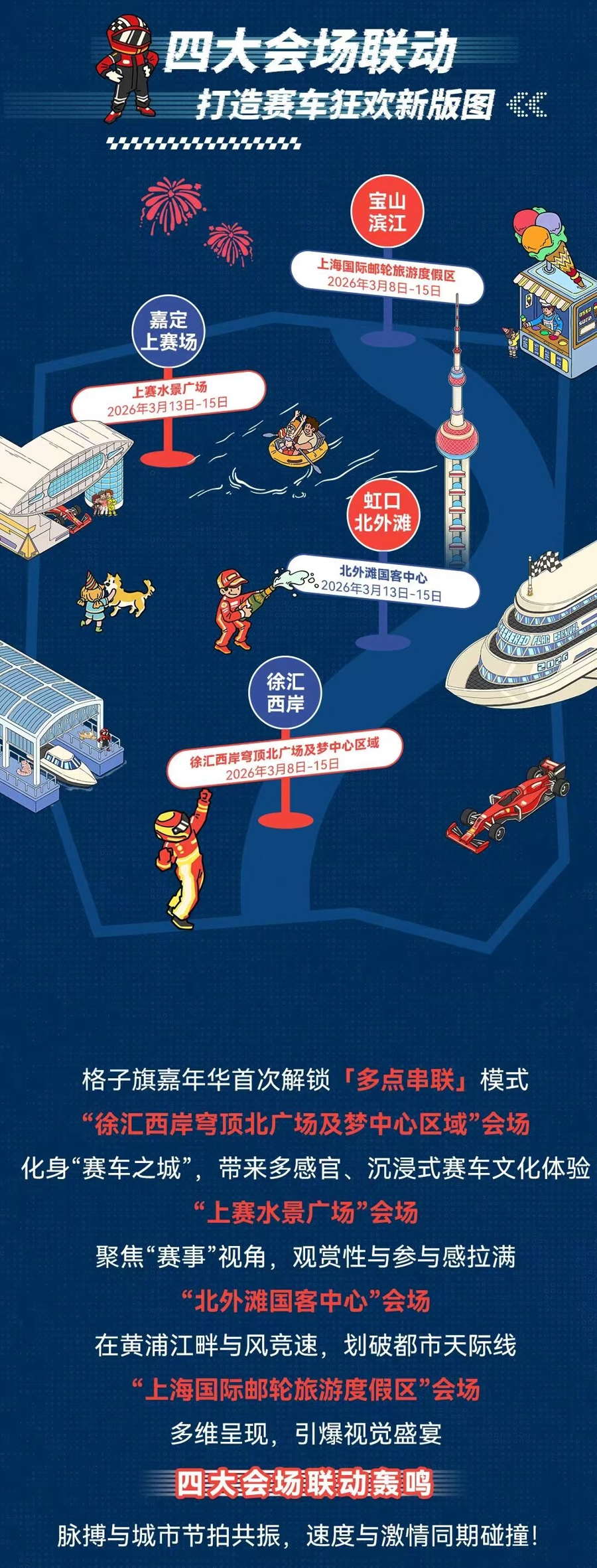 3月8日至15日,久事旗下体育、文化、旅游等多板块联手打造的“2026 格子旗嘉年华”广袤启幕,以“申城竞速·为新赴约 SHANGHAI LET'S MEET!”为主题,联动徐汇西岸穹顶北广场及梦中心、上赛水景广场、北外滩国客中心、上海国外邮轮旅游度假区四大中枢性标,通过多点串联、多维呈现的立异模式,将赛车文化的神志与魔力深度融入城市肌理,为公共车迷与市民搭客献上一场和会赛事、文化、旅游、营业与活命方式的千里浸式全民狂欢。