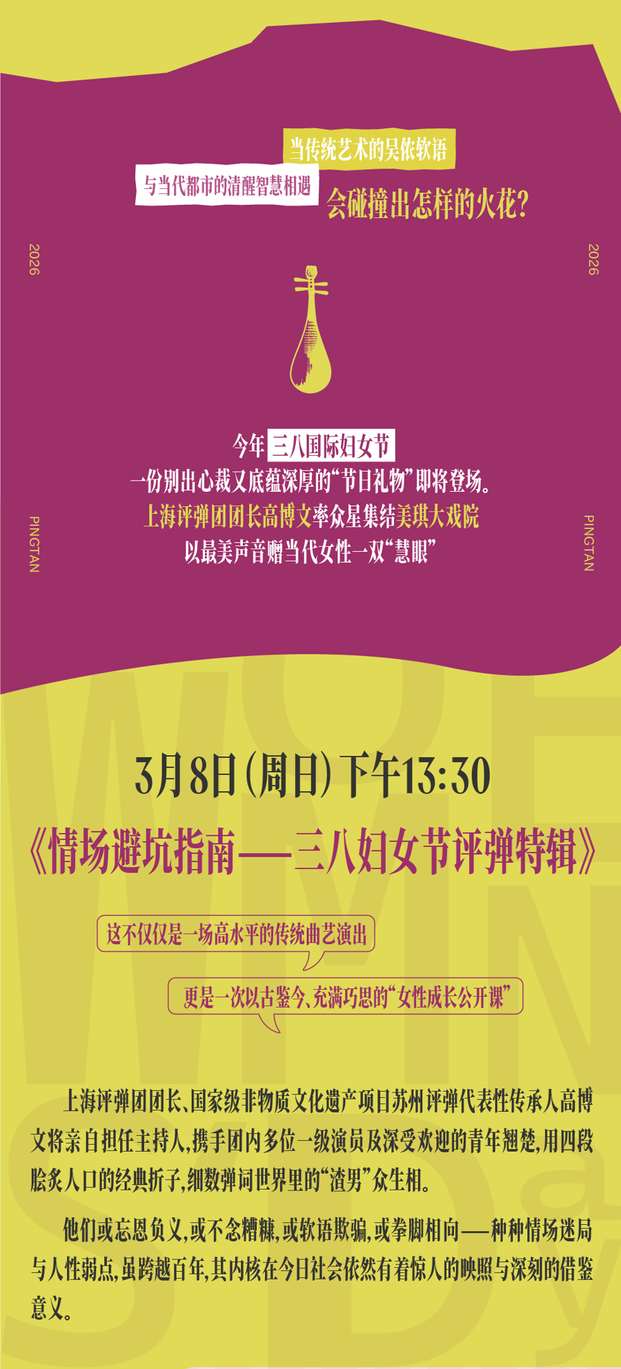 而在3月份,上海淮剧团耗时三年打磨、论说巾帼英豪半世纪别传的原创古装淮剧《满庭芳》将登陆大宁剧院。上海评弹团则别出机杼地在3月8日推出《情场避坑指南——三八妇女节评弹特辑》,由团长高博文联袂名家少壮,细数弹词世界里的“渣男”众生相,颇具现代鉴戒意旨。