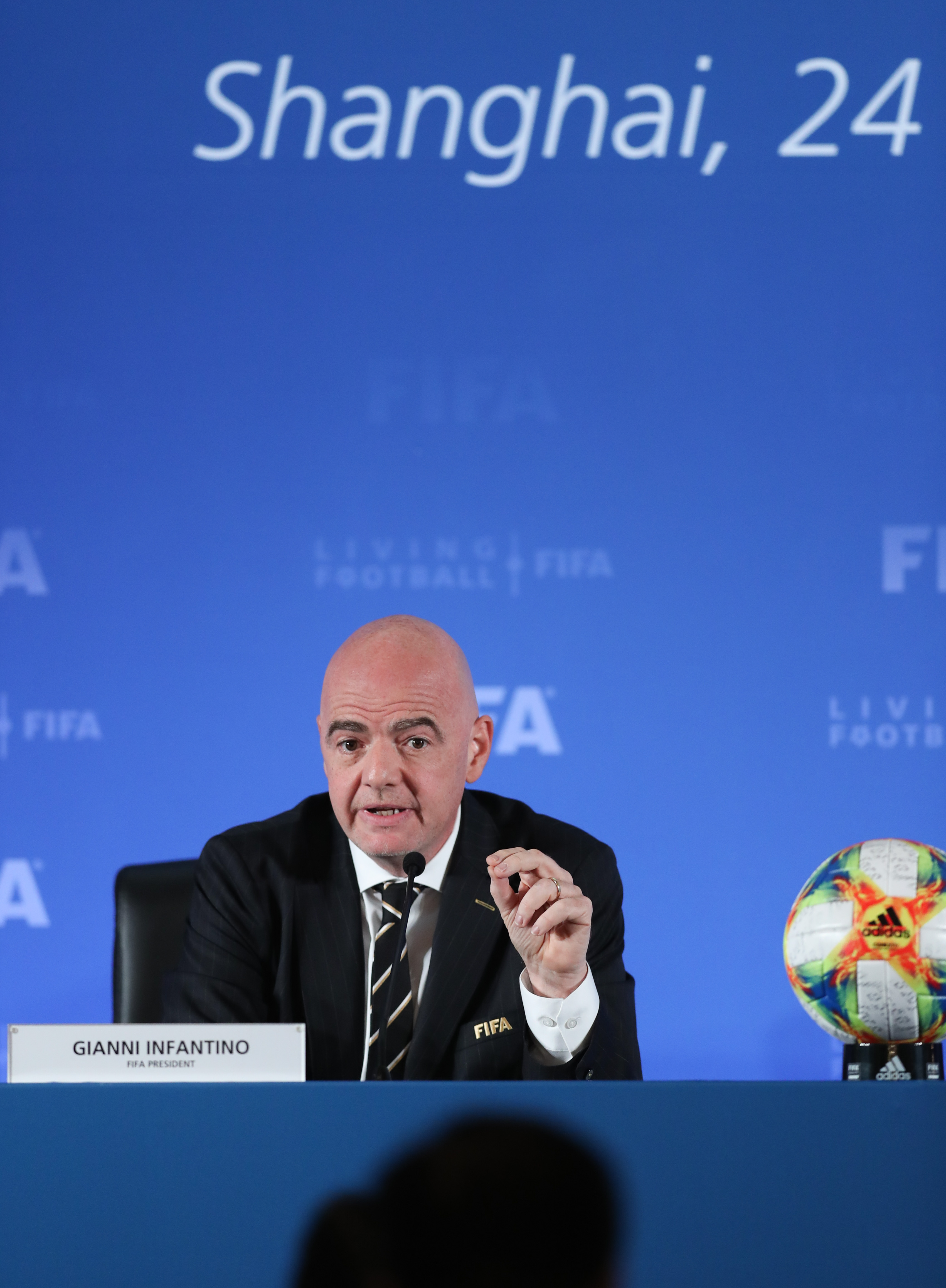 辛勤图:2019年10月24日,海外足联主席因凡蒂诺在上海举行的海外足联理事会新闻发布会上言语。新华社记者 丁汀 摄