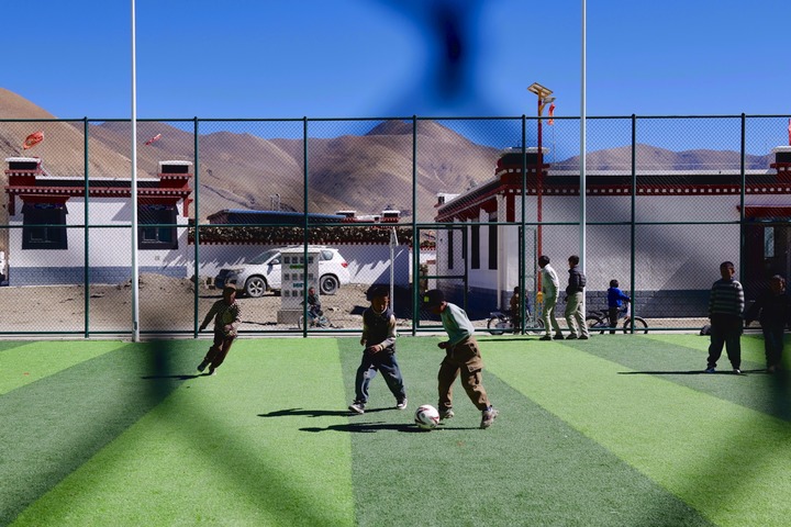这是孩子们在长所乡森嘎村的足球场上踢球。新华逐日电讯记者 周昱龙 摄