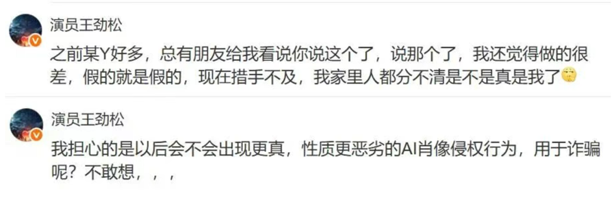 天然在投诉后,平台照旧下架了该视频,但王劲松照旧在评述区与网友交流时暗意担忧:“我家里东谈主齐分不清是不是果真我了,我缅念念的所以后会不会出现更真、性质更恶劣的AI肖像侵权行为,用于糊弄呢?不敢念念……”
