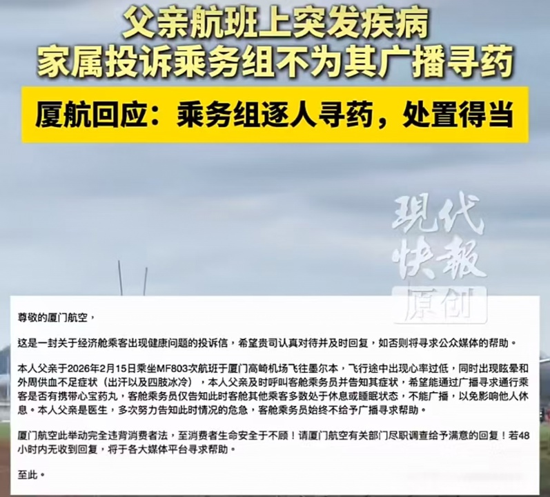 2月24日,乘客家属陈先生反馈,其父亲于2月15日乘坐厦门航空MF803次航班,从厦门高崎海外机场飞往墨尔本。飞行途中,陈父感到身段不适,但愿乘务员能播送寻药,但乘务员以“多数乘客正在休息或寝息,播送会影响他东谈主”为由,莫得播送寻药。陈先生合计,厦门航空的作念法置花消者人命安全于不顾,违抗花消者职权保护法。