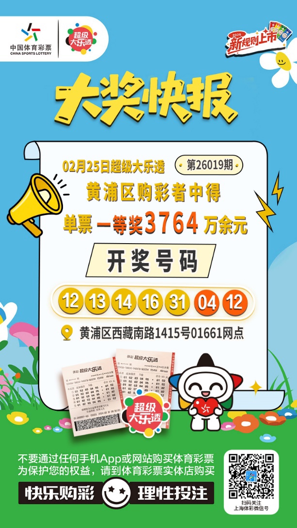 本期本市开出5注大乐透一等奖,均出自位于黄浦区西藏南路1415号,编号为01661的体彩代销网点。中奖票面为一张面值50元的5注直选且进行了5倍投注的彩票,单票奖金3764万余元。这亦然2026年1月31日大乐透新规调理以来,继2月9日普陀、闵行产生大奖后,凤凰彩票welcome本月内上海中出的第三个超等大乐透一等奖。