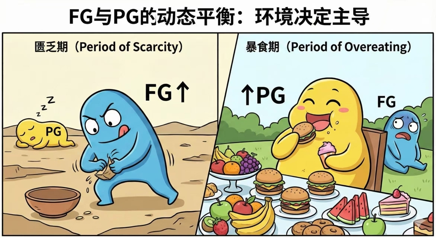 但自从古东说念主类启动打猎、获利猎物后,因为莫得食物储存技艺,他们就必须在告捷打猎后的几天中都暴饮暴食,把食物吃完。要达成暴饮暴食后还有食欲连接吃,把摄入的过剩能量变成脂肪储存起来,到食物匮乏时让脂肪废除、对抗饥饿——这个时候,病生功能群就出场了。